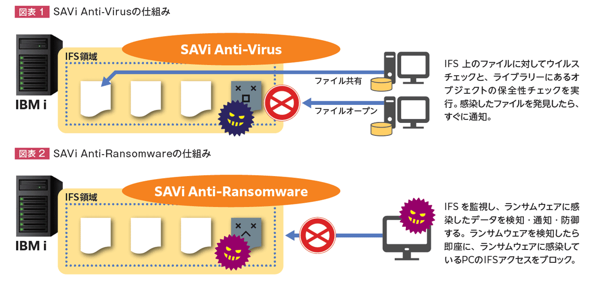 IBM iのセキュリティを機能別に実現する「iSecurity」シリーズには、IBM iのIFS上のファイルをウイルスやランサムウェアから保護するセキュリティソリューションが提供されています。「SAVi Anti-Virus」セイヴィ・アンチウイルス)と「SAVi Anti-Ransomware」(セイヴィ・アンチランサムウェア)です。