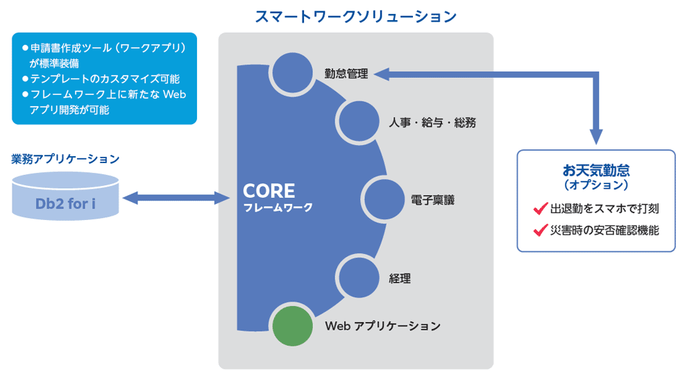 製品は、申請・承認・閲覧・管理などの「コア」機能と、勤怠管理、人事・給与・総務、電子稟議、経理、Webアプリケションの「サブ」機能で構成され、必要なサブ機能から導入し、ほかのサブ機能を順次追加していくことが可能です。
